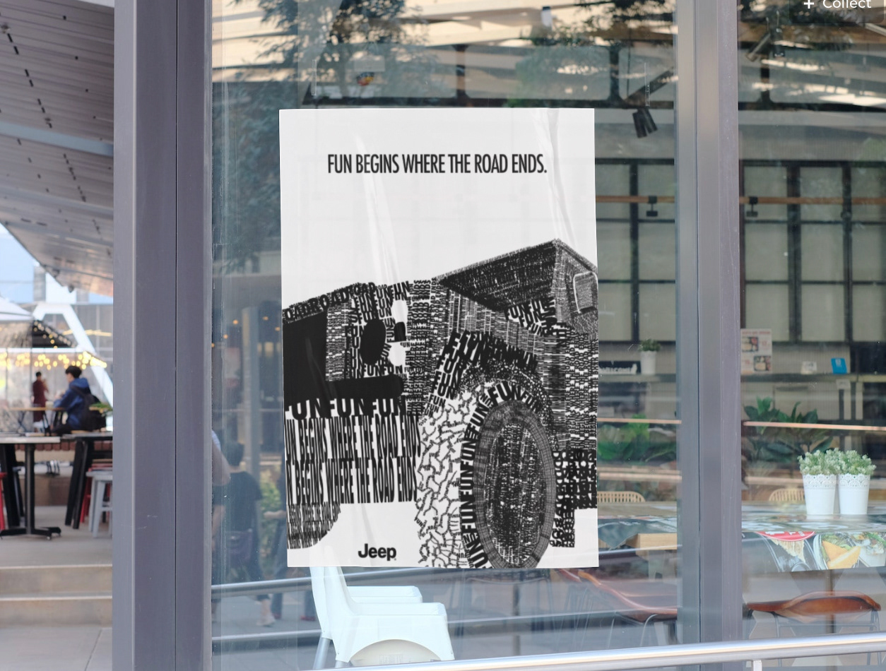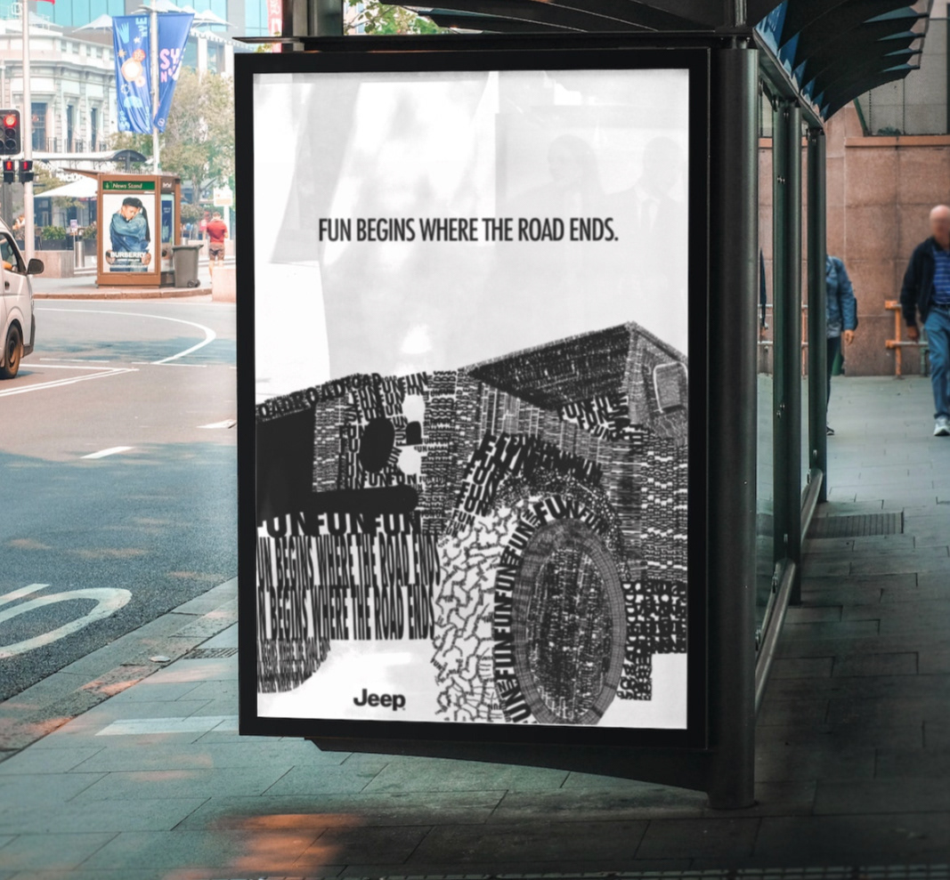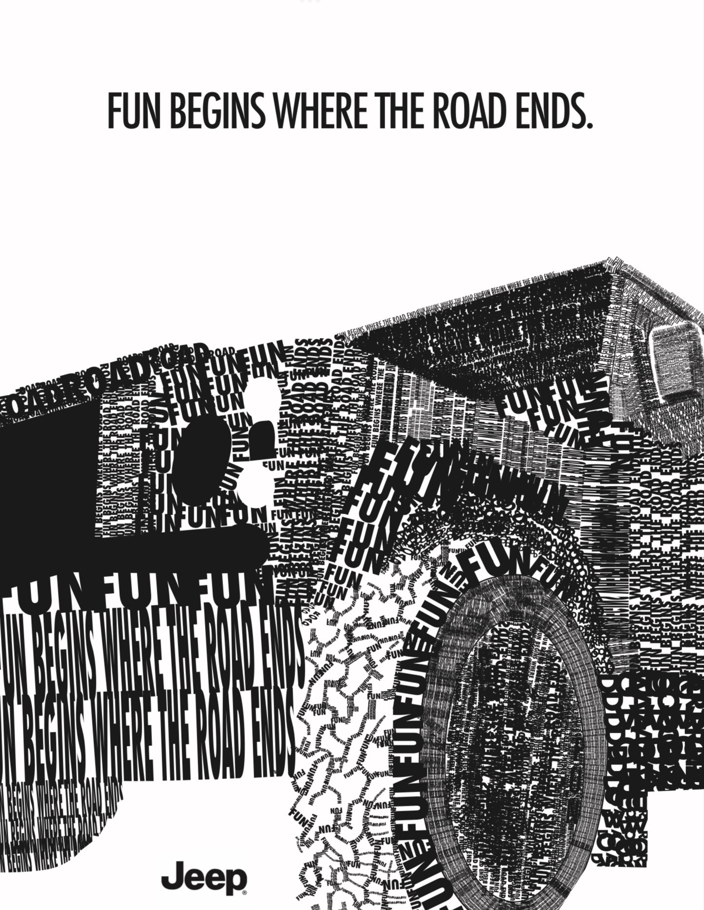 This Jeep ad embodies the spirit of exploration with a design that turns words into wilderness. ‘Fun begins where the road ends’ isn’t just a tagline—it’s the blueprint for this design, inviting viewers to go beyond the paved roads.